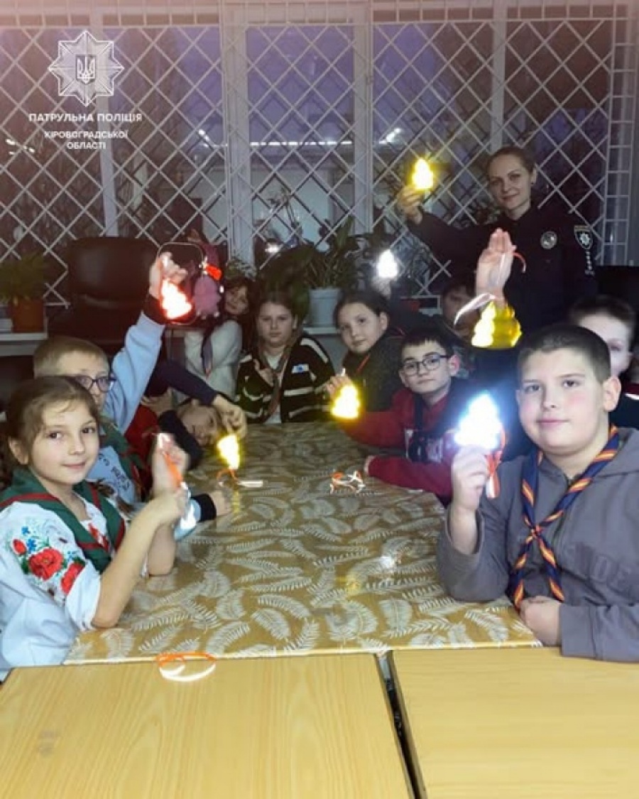 Цього разу поліцейські відділу зв’язків з громадськістю навчали дітей виготовляти флікери у формі ялинки. Тепер всі вони будуть видимі на дорозі.