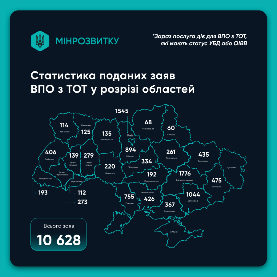 Якщо говорити про регіони походження заявників, то найбільше звернень надходить від людей, які були зареєстровані в Донецькій області (3 566 заяв), Луганській (3 127), Запорізькій (2 067) та Херсонській (1 601) областях.
