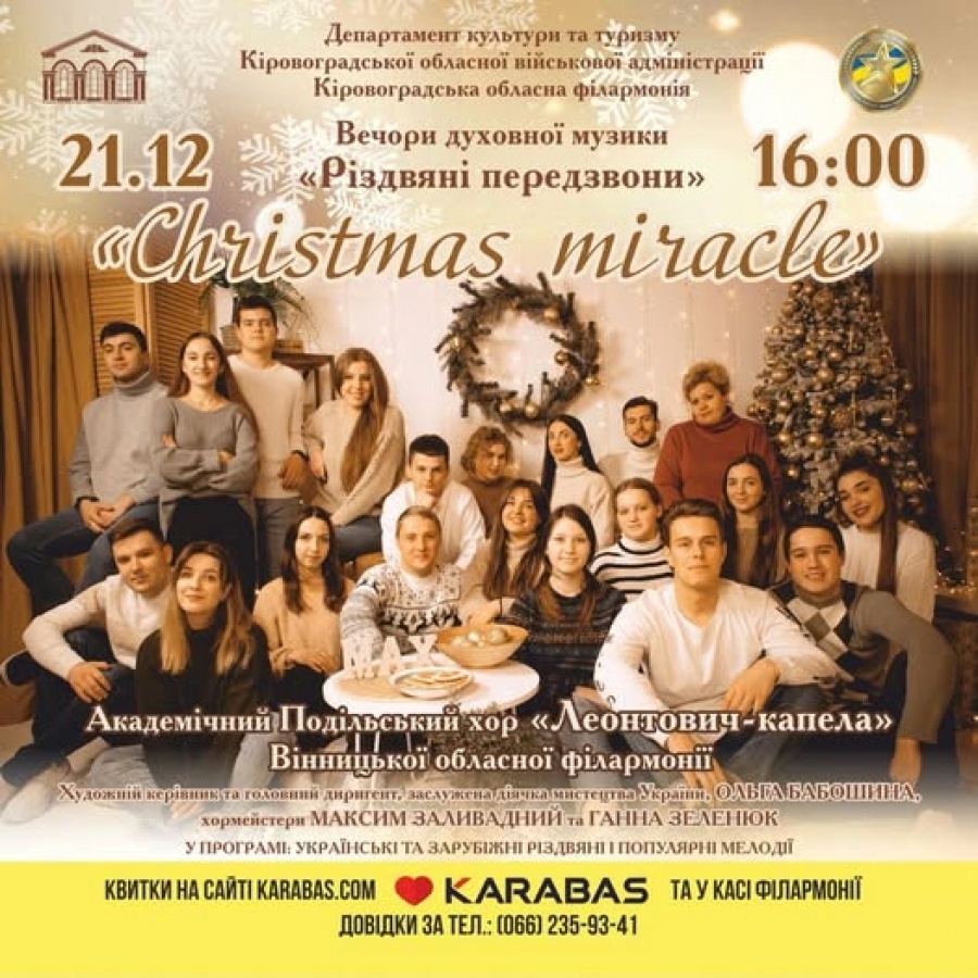 Традиційно кожного року Кіровоградська обласна філармонія проводить концертні програми у рамках проєкту вечори духовної музики «Різдвяні передзвони». Кожної зими – це щось нове, особливе, ні на що не схоже, але незмінно – з тією ж магією Різдва.