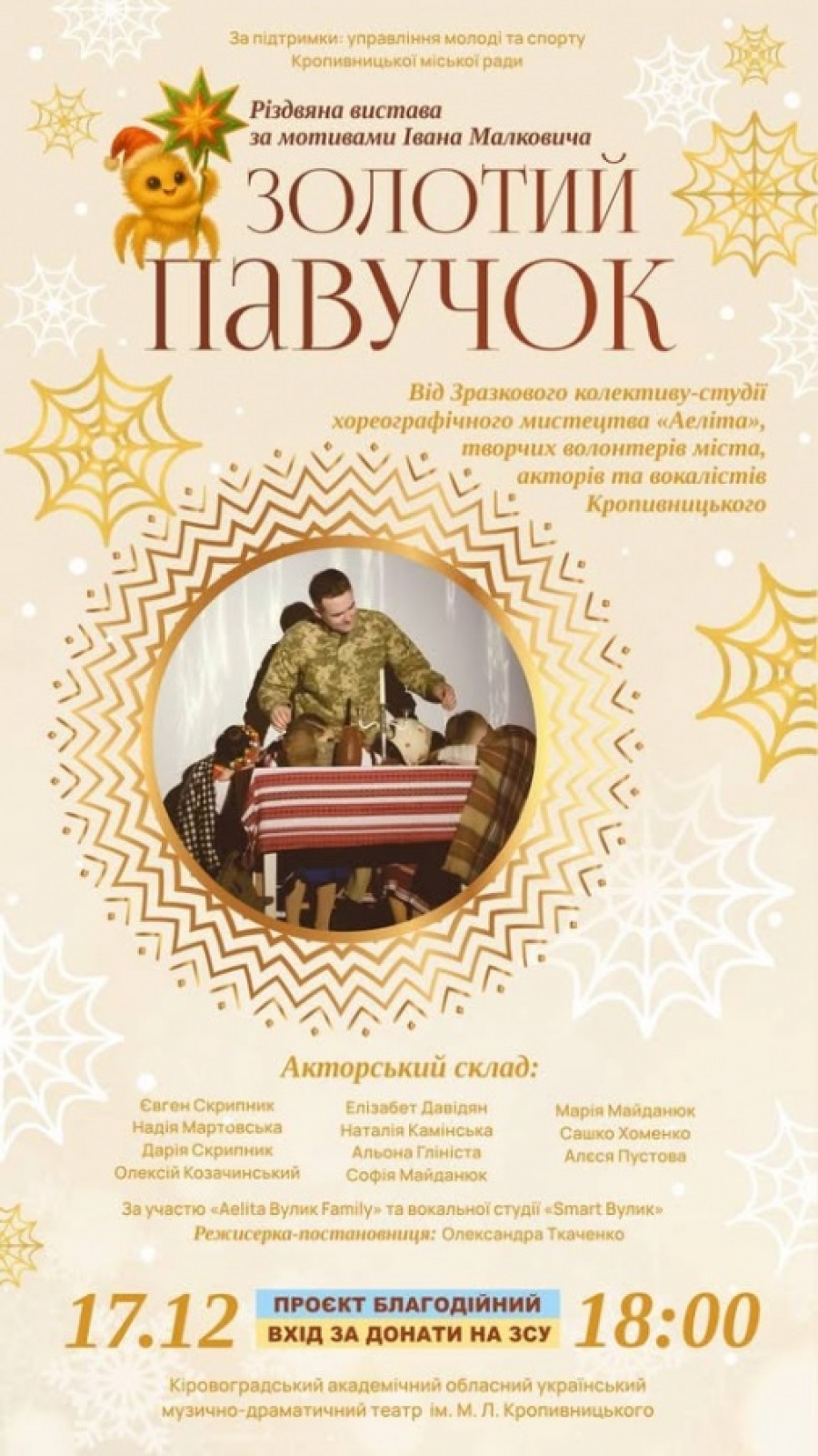 - Це Різдвяна історія про родину, родинні цінності та різдвяну магію добра, - відзначила режисера-постановниця вистави Олександра Ткаченко. - Сценарій написаний за ідеєю та мотивами книги Івана Малковича «Золотий павучок», де кожен і кожна можуть відчути енергію свята та побувати у справжній казці.