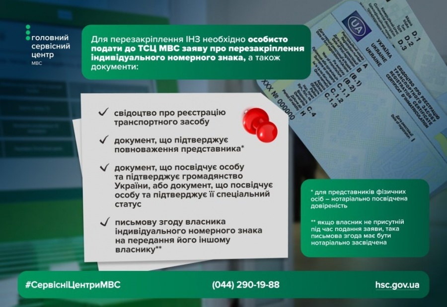 Відповідно до Наказу МВС №174 для перезакріплення ІНЗ необхідно особисто подати до ТСЦ МВС заяву про перезакріплення індивідуального номерного знака. Також взяти з собою перелік документів: