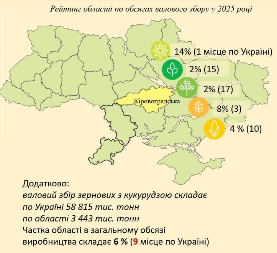 Традиційно основу агровиробництва Кіровоградщини складатимуть зернові та технічні культури - відповідно 48,2% та 46,1% від загальної структури посівів. Такий розподіл зумовлений спеціалізацією регіону та стабільним попитом на продукцію на внутрішньому й зовнішніх ринках.