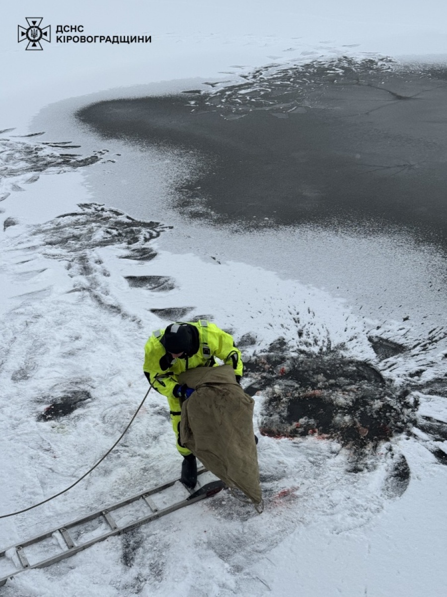 Рятувальники, що прибули за викликом, дістали травмованого птаха з крижаної водойми та передали на тимчасове утримання до реабілітаційного центру Hippos, повідомляє ГУ ДСНС України у Кіровоградській області.