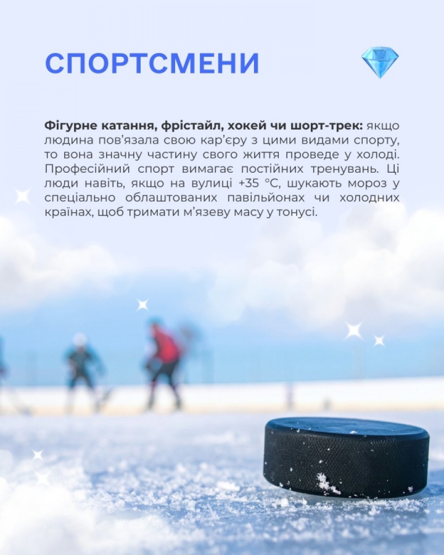 Фігурне катання, хокей, шорт-трек чи фрістайл – це професії, де холод супроводжує спортсменів постійно. Навіть у спеку вони тренуються на льодових аренах, підтримуючи форму. А після завершення кар’єри більшість залишаються у спорті як тренери, продовжуючи «життя на льоду».