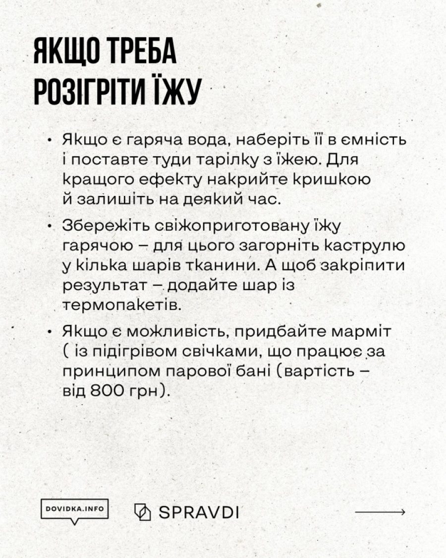 - якщо ви маєте рухатися, можна придбати хімічну грілку (одноразова, призначена для зігрівання в критичних випадках рук чи ніг упродовж 5-6 годин). До голого тіла її прикладати не можна – обов’язково має бути шар одягу.
