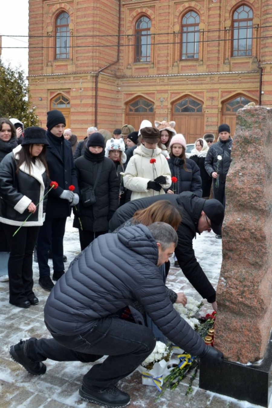 Після хвилини мовчання перший заступник голови Кіровоградської обласної ради Юрій Семенюк, заступниця начальника ОВА Катерина Колтунова, заступник міського голови Кропивницького Олександр Мосін, начальник відділу комунікацій з громадськістю Кропивницької міської ради, депутат обласної ради Оксана Горбенко, представники єврейської громади, волонтери та жителі міста поклали квіти та камінці до пам’ятного знаку «Жертвам Голокосту».