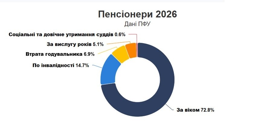 За даними Пенсійного фонду на початок 2026 року, в Україні проживали 10,17 мільйона пенсіонерів, за рік їхня кількість зменшилась на 170 тисяч, йдеться у дописі. Більшість, майже 73% – пенсіонери за віком, майже 15% отримують пенсію по інвалідності. За рік середня виплата по країні збільшилась на 13% (з 5789 гривень) і становить 6544 гривень.