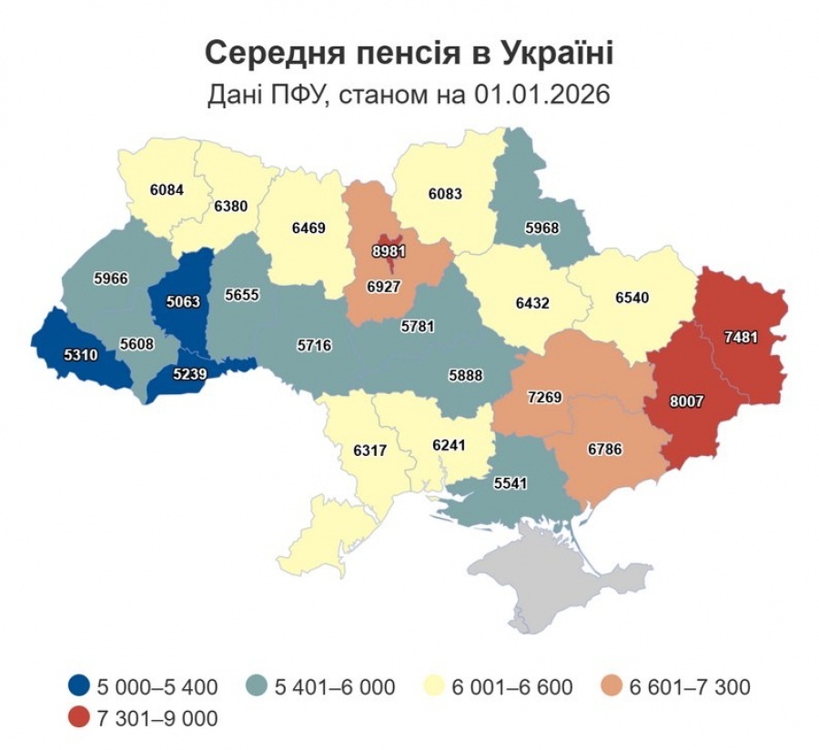 Найвищий середній показник пенсійних виплат – у Києві (8981 гривня), найнижчий – на Тернопільщині (5063 гривень). Середня пенсія на Кіровоградщині, якщо порівнювати з початком 2025 року, на майже 12,5% (з 5234 гривень 81 копійки).