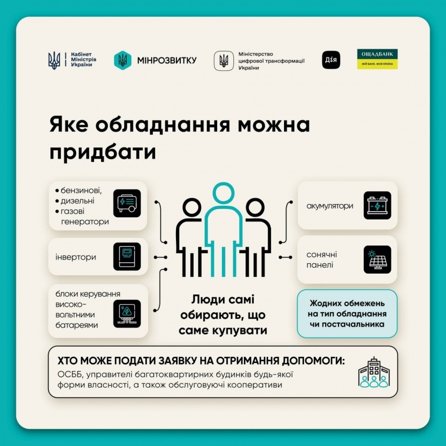 Подати заявку зможуть ОСББ, житлові та обслуговуючі кооперативи, управителі багатоквартирних будинків незалежно від форми власності. Програма не передбачає обмежень у виборі обладнання чи постачальника.