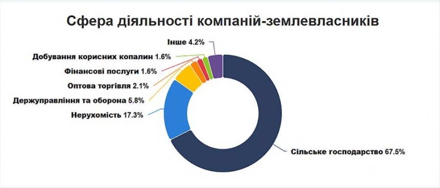 Більшість великих землевласників працюють у сільському господарстві – це 129 компаній (67,5% від загальної кількості). 33 компанії (17,3%) займаються операціями з нерухомістю, 11 (5,8%) – державним управлінням та обороною, чотири (2,1%) – оптовою торгівлею, три (1,6%) – фінансовими послугами, ще три (1,6%) працюють у сфері добування корисних копалин, решта, вісім, компаній (4,2%) займаються іншою діяльністю.