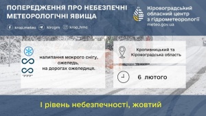 Кіровоградський обласний центр з гідрометеорології повідомляє, що 6 лютого очікується ожеледь (6-19 мм), налипання мокрого снігу (11-34 мм), на дорогах утримається ожеледиця.