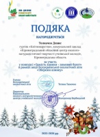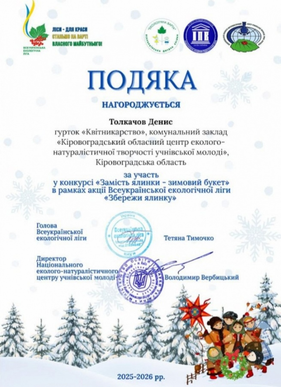 Вихованець гуртка «Квітникарство» Кіровоградського обласного центру еколого-натуралістичної творчості учнівської молоді (ОЦЕНТУМ) Денис Толкачов отримав Подяку за участь у щорічному конкурсі «Замість ялинки – зимовий букет».