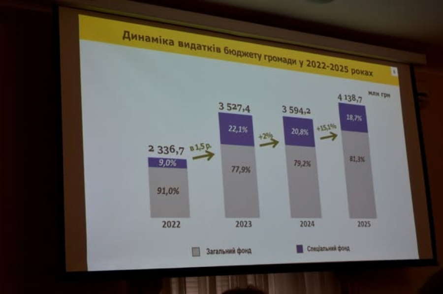 Видатки бюджету територіальної громади за 2025 рік проведені у сумі 4 138,7 млн грн, або 93,4 % від уточненого річного плану, у тому числі по загальному фонду – 3 366,3 млн грн, спеціальному фонду – 772,4 млн грн.