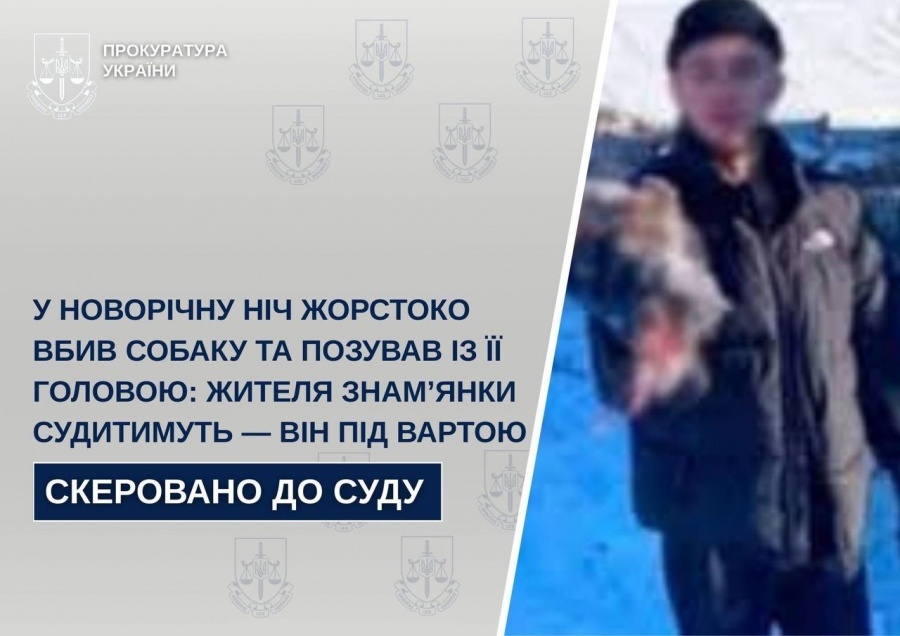 За процесуального керівництва Знам’янської окружної прокуратури до суду скеровано обвинувальний акт стосовно 19-річного жителя м. Знам’янка за фактом жорстокого поводження з твариною, що призвело до її загибелі, вчиненого з особливою жорстокістю та у присутності неповнолітнього (ч. 3 ст. 299 КК України). Обвинувачений перебуває під вартою.