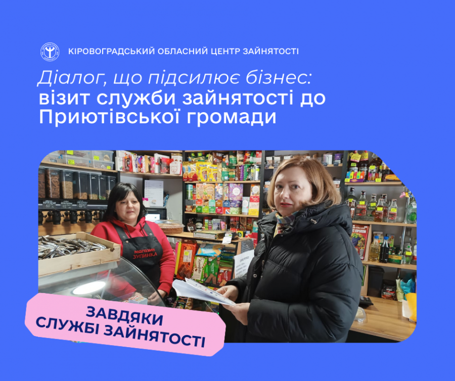 Фахівці Олександрійської філії обласного центру зайнятості відвідали Приютівську територіальну громаду. У межах візиту було організовано роботу на базі Центру надання адміністративних послуг, де громадянам надавали індивідуальні консультації, а також проведено зустрічі з роботодавцями сфери послуг та торгівлі безпосередньо на їхніх робочих місцях.