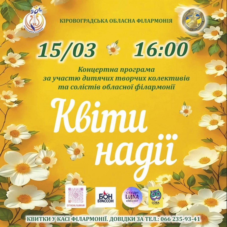 У неділю, 15 березня, о 16:00 год. обласна дитяча філармонія запрошує на особливий весняний концерт «Квіти надії», де юні артисти подарують глядачам світлий настрій, щирість і натхнення.