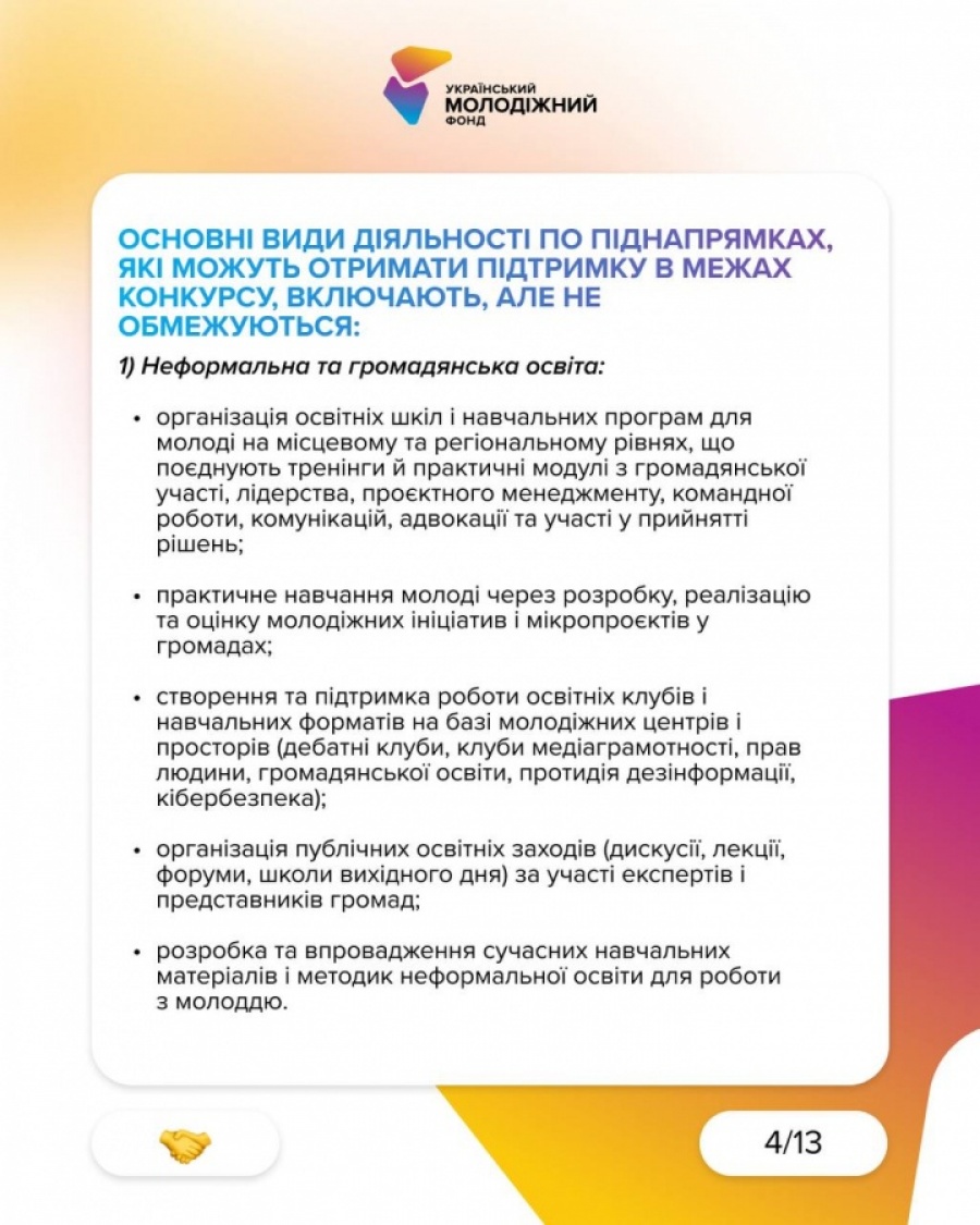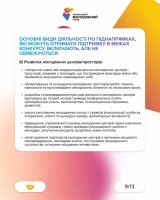 - громадянська та неформальна освіта, молодіжні обміни, локальні проєкти розвитку, підтримка молоді після повернення з-за кордону, мобільна молодіжна робота та підвищення кваліфікації фахівців.