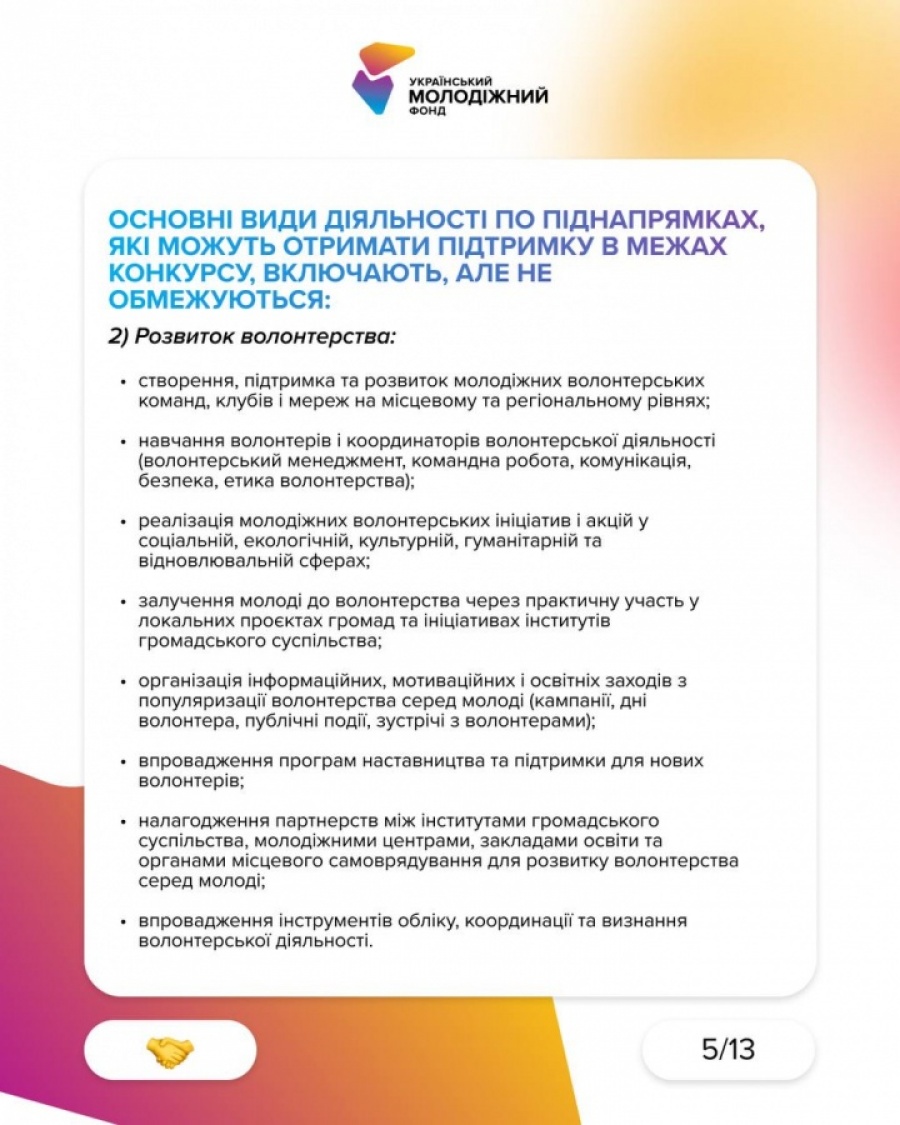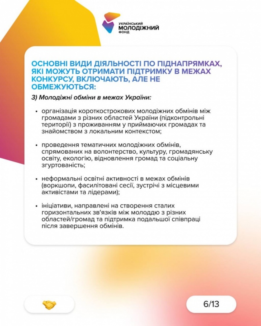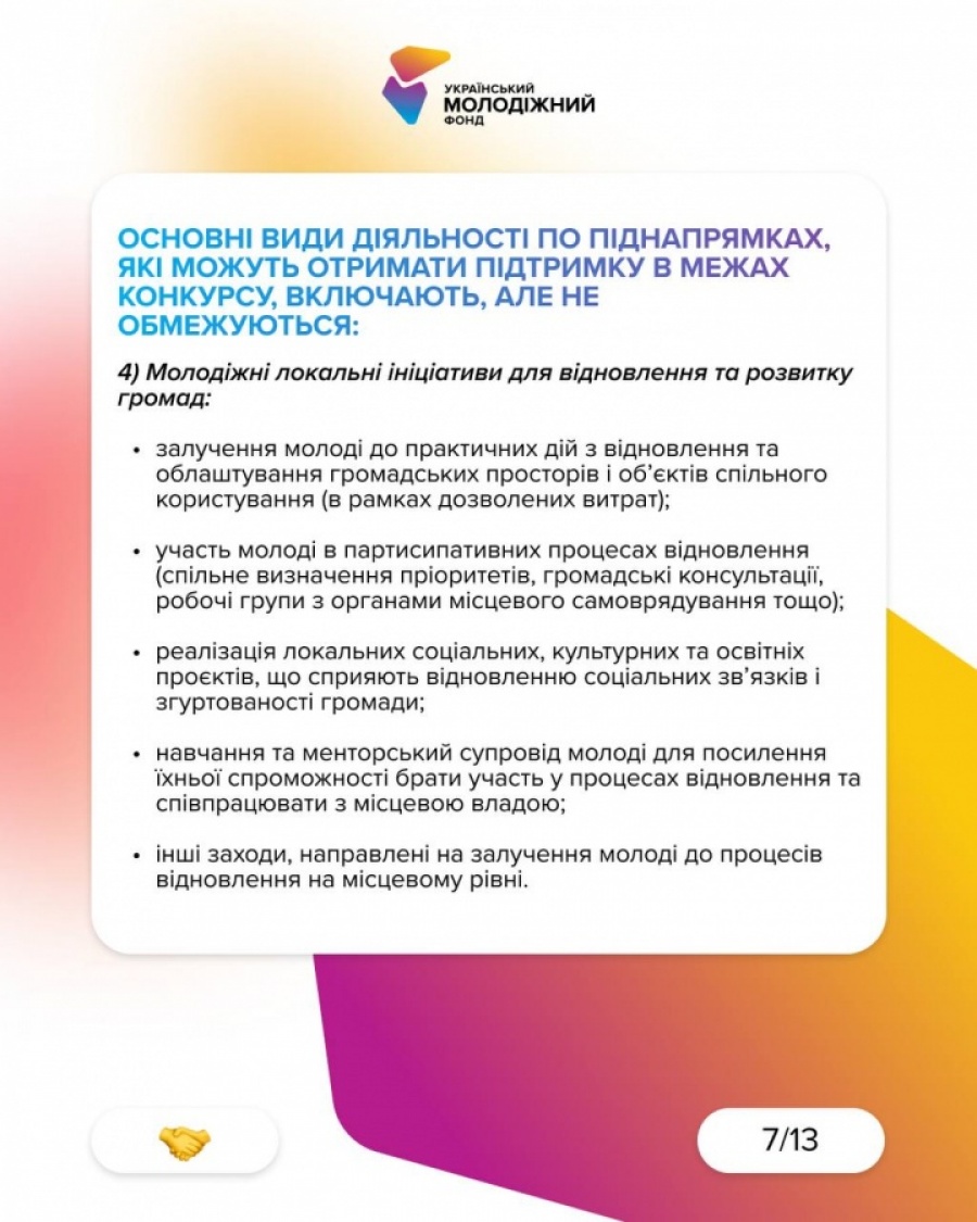 Конкурс за пріоритетним напрямом «Розширення участі молоді у суспільному житті та зміцнення соціальної згуртованості» для фізичних осіб реалізується Міністерством молоді та спорту України і Українським молодіжним фондом.