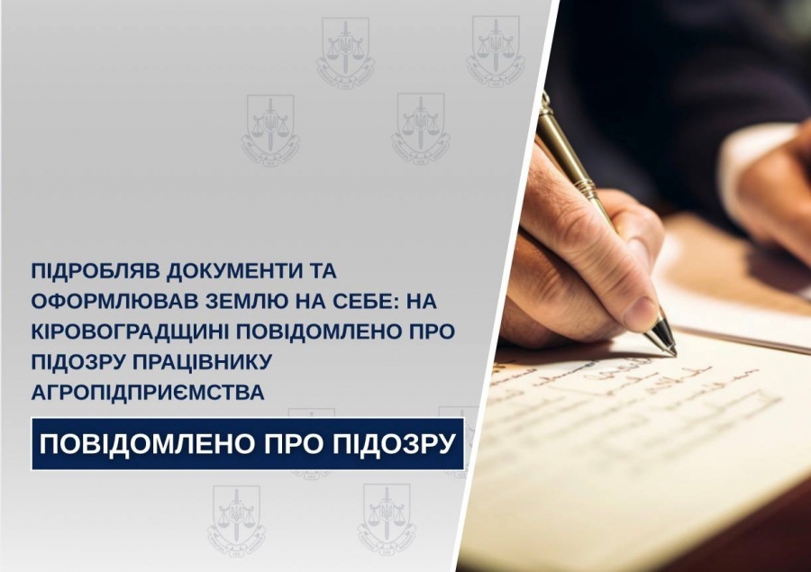 За процесуального керівництва прокурорів у кримінальному провадженні щодо шахрайських дій під час купівлі-продажу земельних ділянок повідомлено про підозру колишньому фахівцю із землеустрою одного з агропідприємств Олександрійського району. Йому інкриміновано підроблення офіційних документів, використання завідомо підроблених документів та шахрайство, вчинене у великих розмірах.