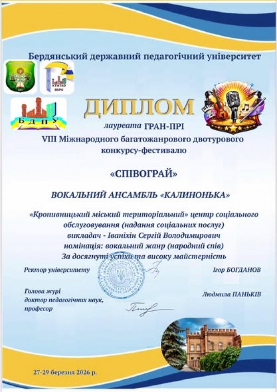 Вокальний колектив "Калинонька" Комунальної установи "Кропивницький міський територіальний центр соціального обслуговування (надання соціальних послуг)" Кропивницької міської ради під керівництвом викладача колективу Сергія Іваніхіна взяв участь у конкурсі-фестивалі "Співограй".