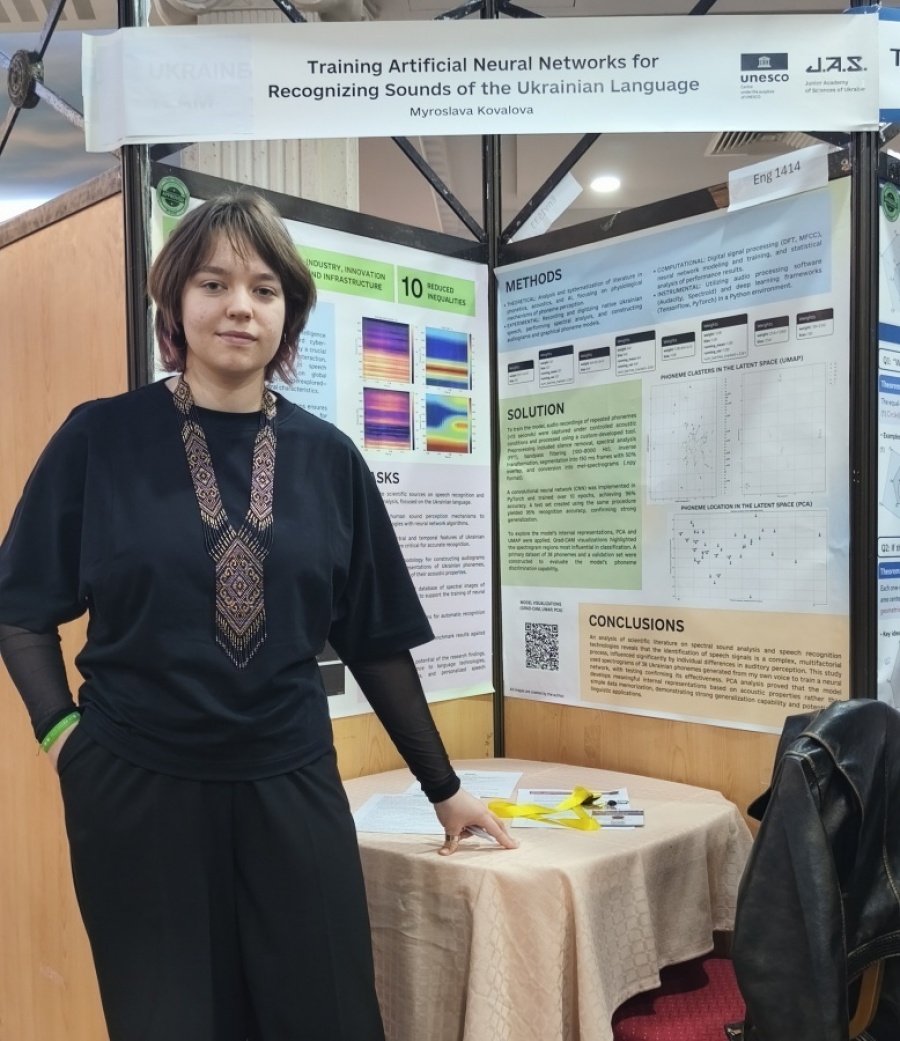 Мирослава Ковальова представила на розгляд міжнародного журі проєкт на тему: «Навчання штучних нейронних мереж розпізнавання звуків української мови». Робота юної дослідниці продемонструвала високий рівень сучасної української науки та актуальність інтеграції штучного інтелекту в лінгвістичну сферу.